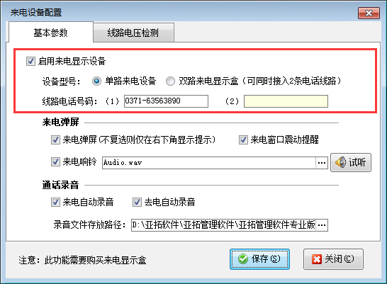 來電設備配置:使用來電彈屏功能首先需要外接設備來電顯示盒,來電顯示盒連接配置好之后需要在軟件內啟用來電顯示設備并設置線路電話號碼,來電顯示配置如下圖所示: