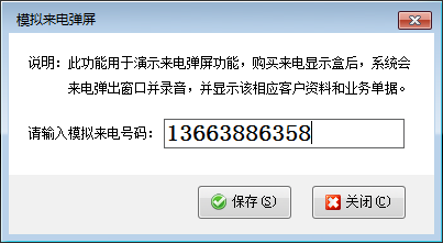 模擬來電:此功能可以實際模擬演示來電彈屏功能,在模擬來電彈屏窗口輸入模擬來電號碼,點擊“保存”后系統會自動彈出來電彈屏窗口,如下圖所示: