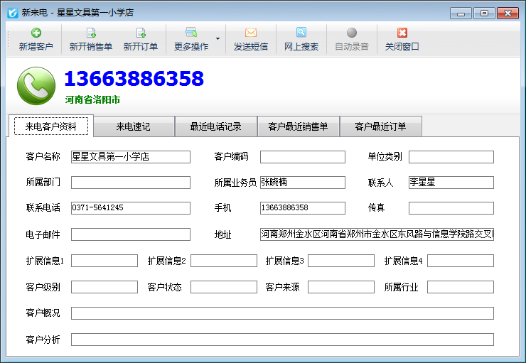 來電彈屏:客戶來電時,來電彈屏窗口會自動顯示出在“基礎資料”——》“客戶資料”內維護好的此客戶的相關信息、客戶最近電話記錄、客戶最近銷售單及客戶最近訂單,使得您可以在通話之前可以全面了解客戶信息。