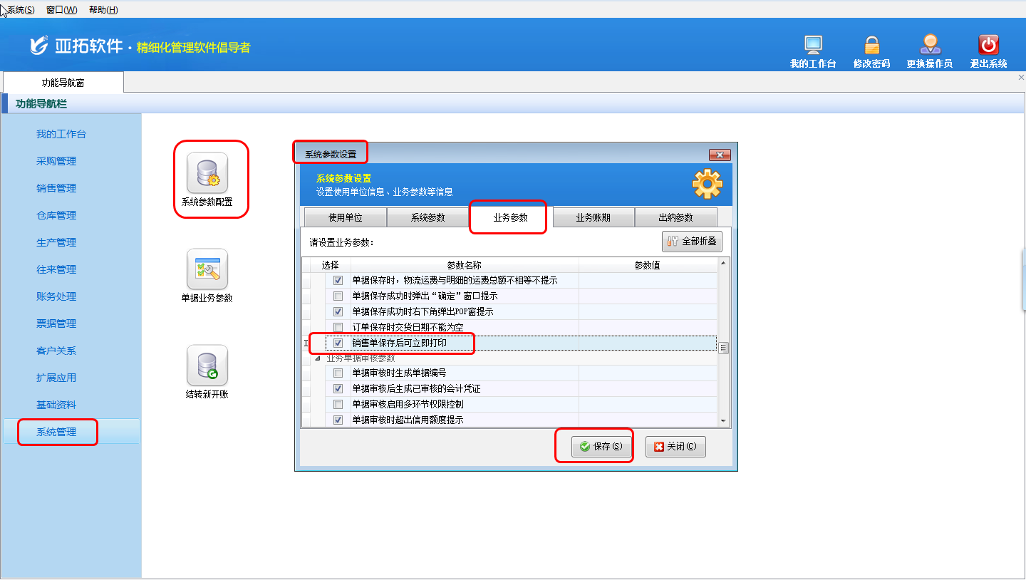 在功能導(dǎo)航窗點擊“系統(tǒng)管理”——》“系統(tǒng)參數(shù)配置”打開系統(tǒng)參數(shù)配置界面,在“系統(tǒng)參數(shù)設(shè)置”——》“業(yè)務(wù)參數(shù)”——》“業(yè)務(wù)單據(jù)保存參數(shù)”中打勾選中“銷售單保存后可立即打印”選項啟用“銷售單保存后可立即打印”此功能,配置完之后點擊“保存”按鈕保存設(shè)置即可,如下圖所示。