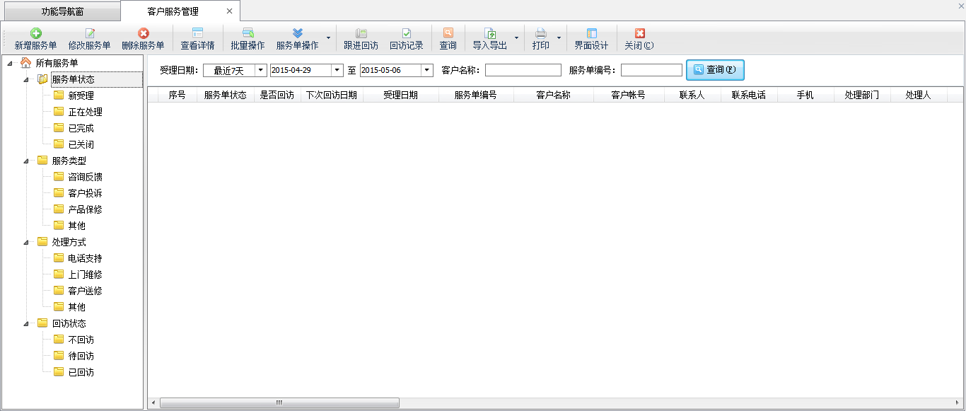 在界面左側導航樹中按照服務單狀態、服務類型、處理方式、回訪狀態等進行分類,點擊后可以顯示相應類別的客戶服務單資料。