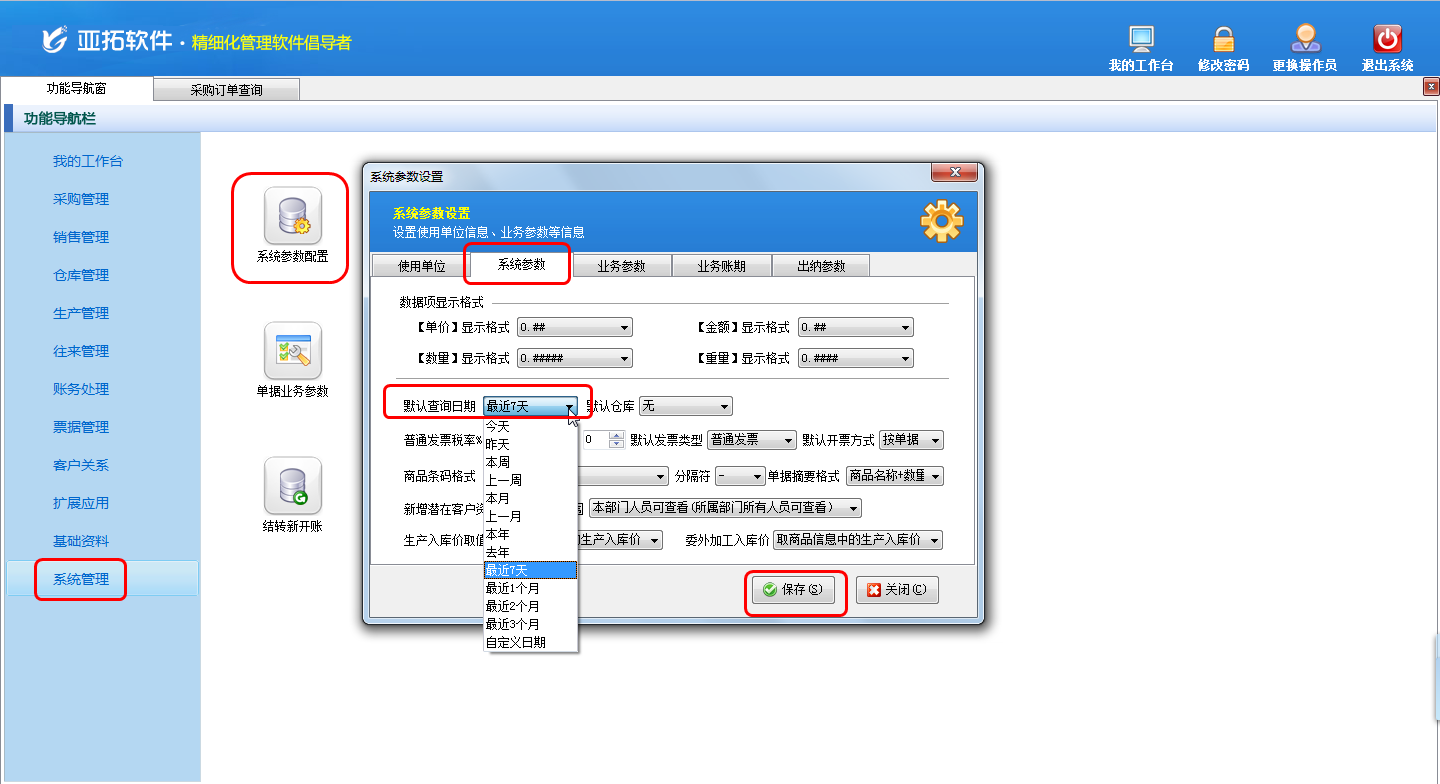 在功能導(dǎo)航窗點(diǎn)擊“系統(tǒng)管理”——“系統(tǒng)參數(shù)配置”——“系統(tǒng)參數(shù)”,在“系統(tǒng)參數(shù)”界面可以修改“默認(rèn)查詢?nèi)掌凇保ㄟ@里修改為“最近7天”),修改完成之后點(diǎn)擊“保存”按鈕保存配置。