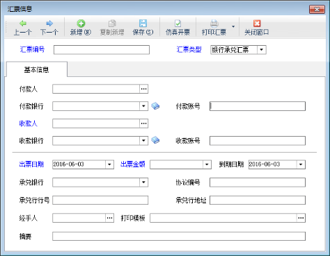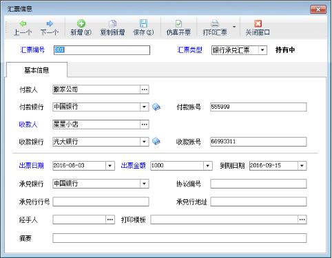 承兌匯票管理功能主要包括登記匯票、修改匯票、刪除匯票、查看匯票詳情、導(dǎo)入導(dǎo)出匯票數(shù)據(jù)、打印匯票、刷新匯票列表。