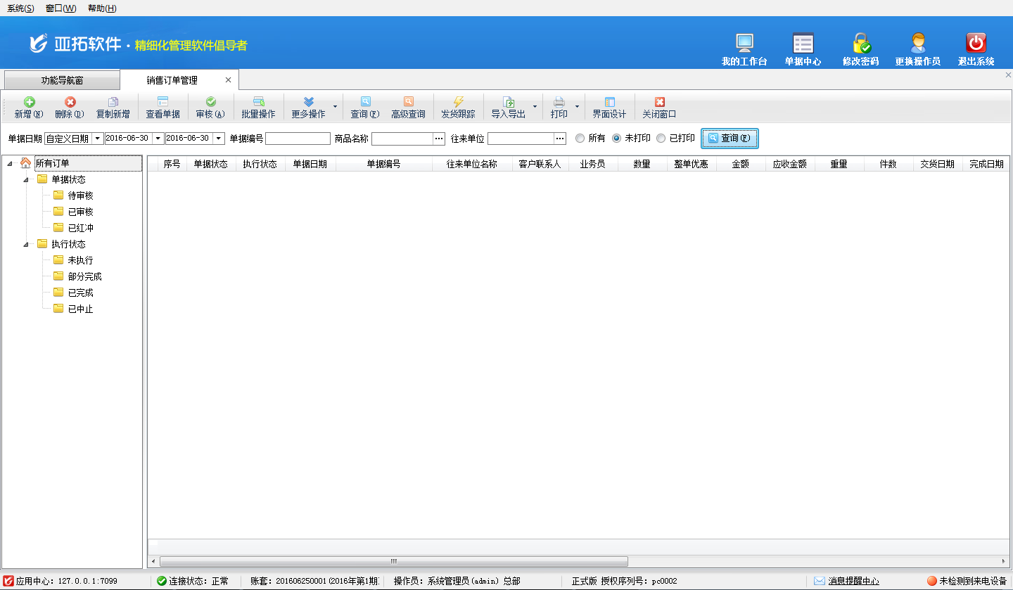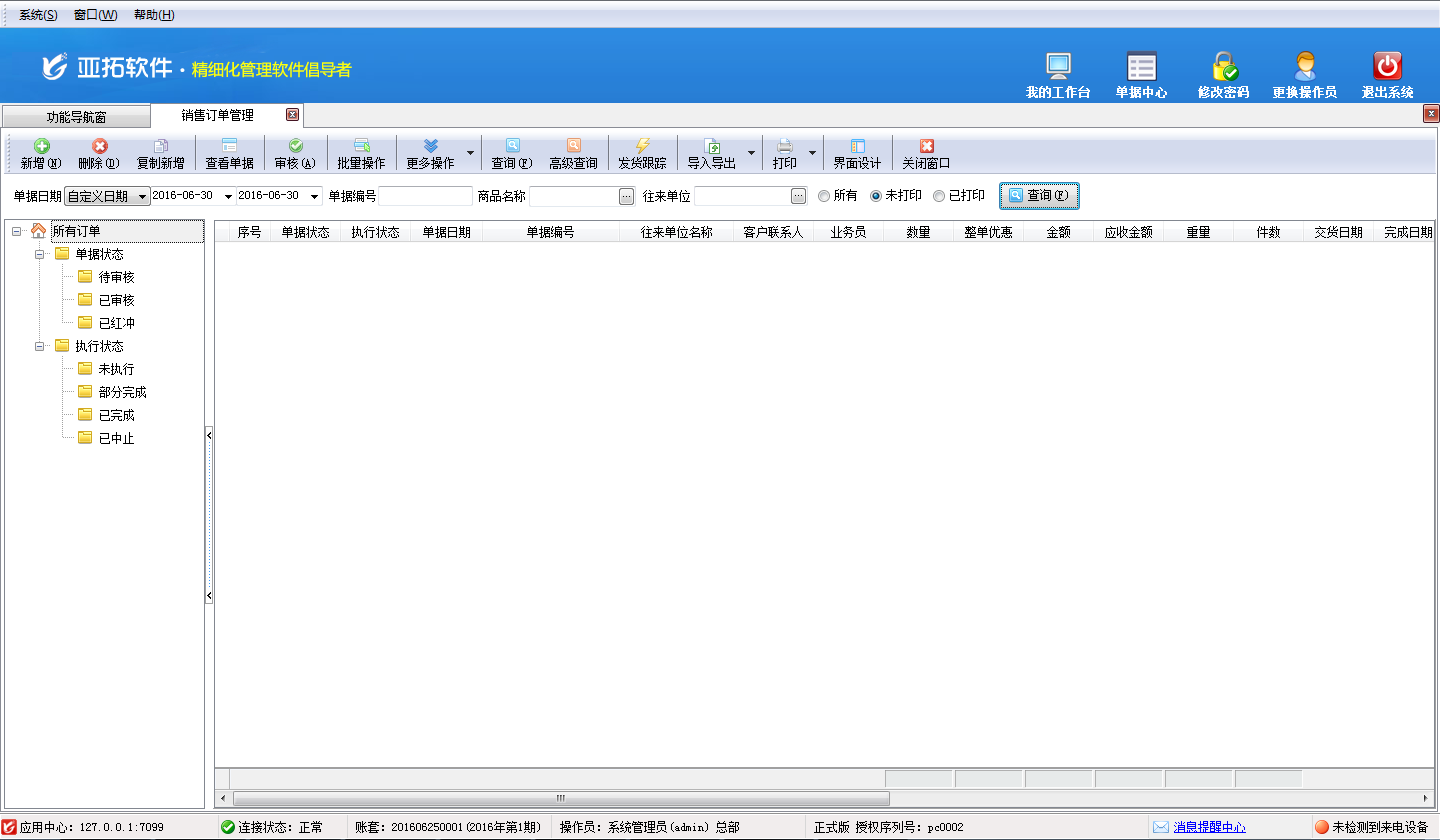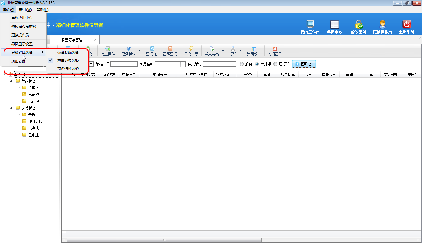 亞拓管理軟件內(nèi)提供了3種不同的界面風格(標準系統(tǒng)風格、灰白經(jīng)典風格、藍色情懷風格),軟件安裝后默認為“灰白經(jīng)典風格”,如下圖所示。