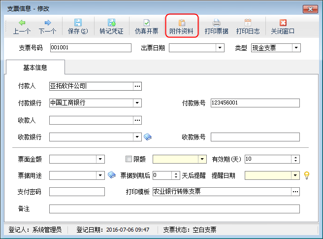 紅管家票據打印軟件開單后,自動保存數據,方便以后查閱或打印,填開支票、承兌匯票、快遞單以及其他票據時,軟件支持添加文檔、圖表等附件資料,可掃描或導入與票據相關的電子文件,方便用戶更全面、直接地查詢票據的全過程,有利于企業票據管理控制。下面我們介紹一下附件資料管理功能的使用。