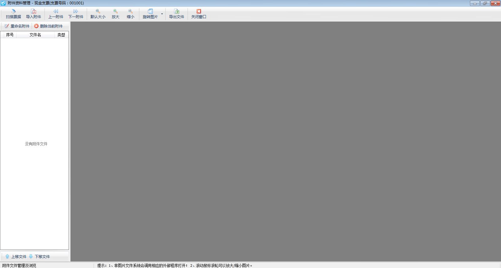 在填開或者修改票據的界面,如圖1所示,點擊工具欄中的“附件資料”按鈕,可以進入“附件資料管理”界面,如圖2所示,可掃描或導入與票據相關的電子文件。