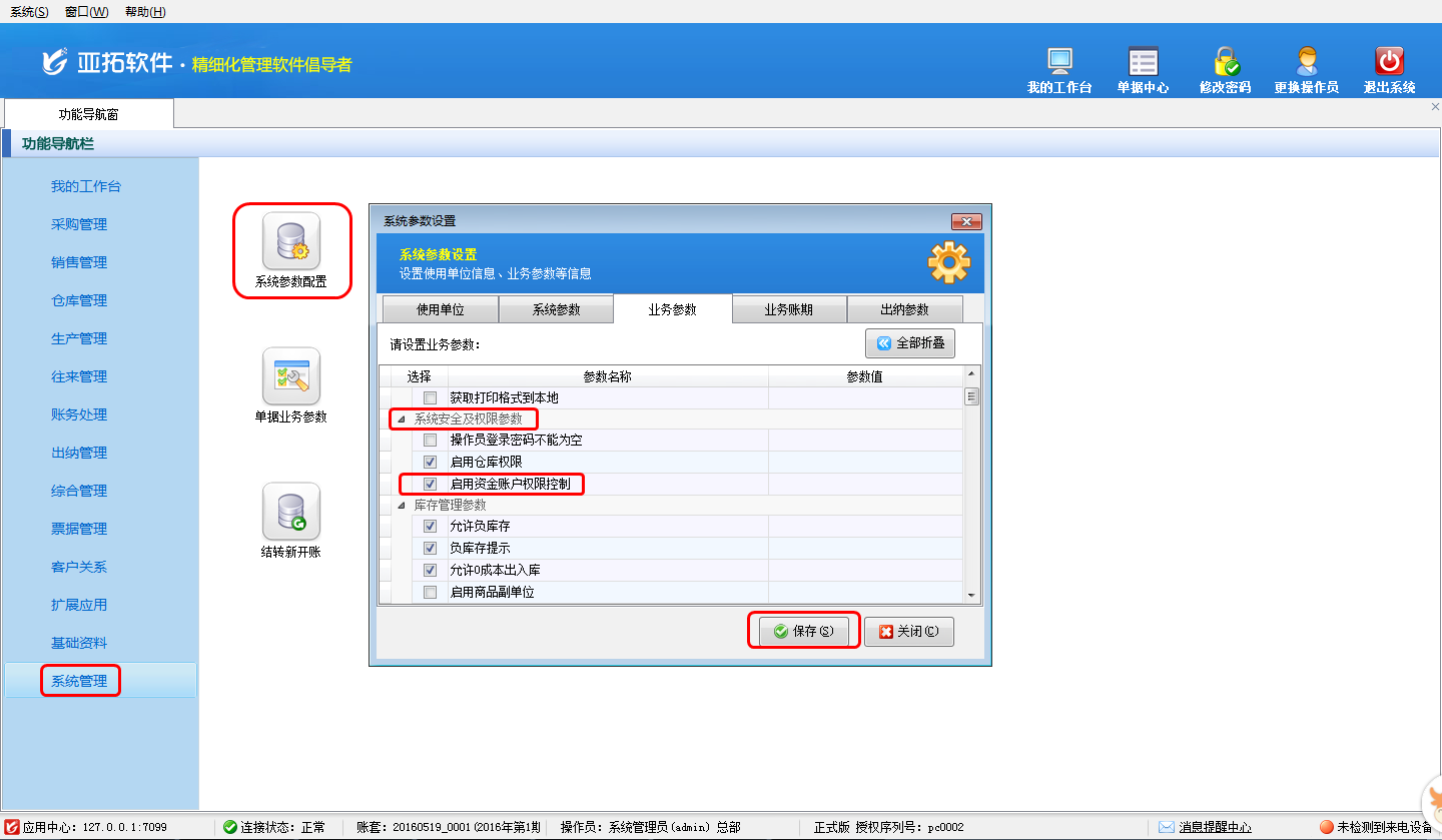 亞拓管理軟件、紅管家送貨單軟件、紅管家財(cái)務(wù)出納記賬軟件等都可以設(shè)置操作員的資金賬戶控制權(quán)限,本篇文章以亞拓管理軟件專業(yè)版為例介紹一下如何設(shè)置操縱員的資金賬戶控制權(quán)限,通過(guò)“系統(tǒng)管理”——》“系統(tǒng)參數(shù)配置”——“業(yè)務(wù)參數(shù)”可以進(jìn)入“業(yè)務(wù)參數(shù)”配置界面,在系統(tǒng)安全及權(quán)限參數(shù)內(nèi)可以啟用“啟用資金賬戶控制權(quán)限”參數(shù),如下圖一所示。