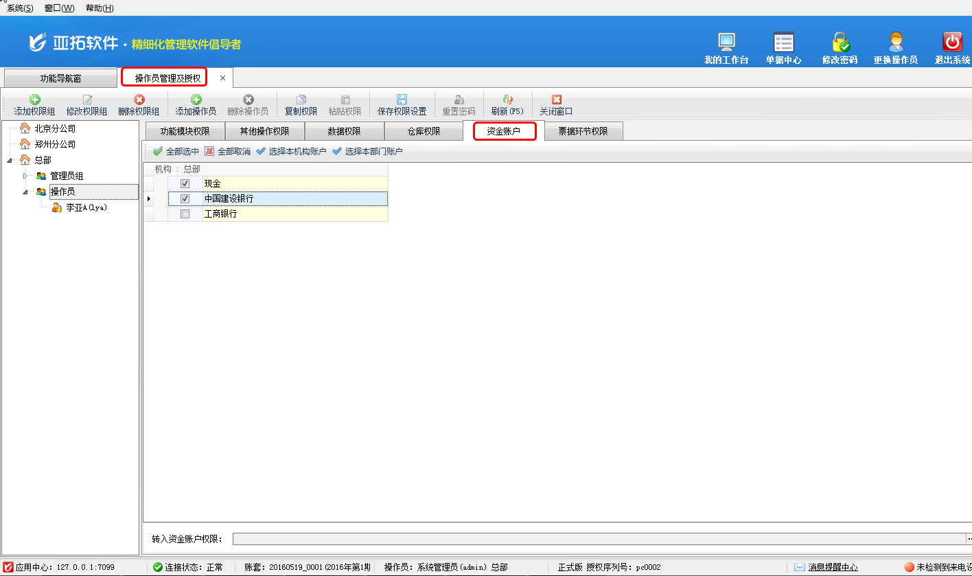 參數(shù)“啟用資金賬戶權(quán)限控制”啟用之后,通過(guò)系統(tǒng)管理員登錄軟件修改資金賬戶權(quán)限,在功能導(dǎo)航窗點(diǎn)擊“系統(tǒng)管理”——》“操作員及授權(quán)”進(jìn)入操作員管理及授權(quán)界面,在權(quán)限模塊可以看到“資金賬戶”,在此可以設(shè)置操作員的資金賬戶權(quán)限。如下圖二所示,設(shè)置操作員“李亞”沒(méi)有“工商銀行”的權(quán)限,然后點(diǎn)擊“保存權(quán)限設(shè)置”進(jìn)行保存權(quán)限設(shè)置。