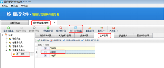 亞拓管理軟件、紅管家倉庫管理軟件都可以設置操作員的倉庫控制權限,下面我們以亞拓管理軟件專業版為例介紹一下如何設置操作員的倉庫控制權限。