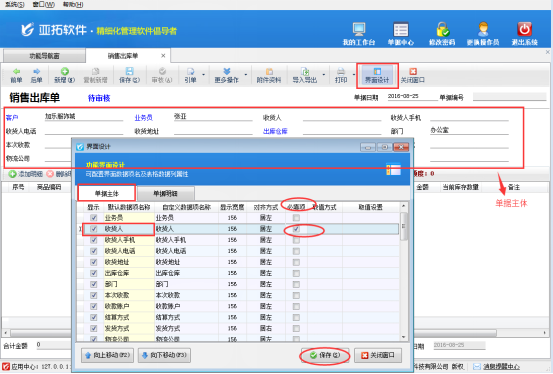 為了避免在開單的時候漏掉必須要填寫的信息,亞拓管理軟件、紅管家倉庫管理軟件、紅管家送貨單軟件等支持設計單據主體必填項。下邊以亞拓管理軟件專業版“銷售出庫單”開單為例,設置單據主體必填項。