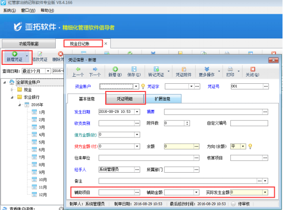 紅管家出納記賬軟件、亞拓管理軟件(標準版、專業版)中的出納管理模塊,在新增憑證中有的需要填寫輔助項目和憑證明細,軟件支持設置在新增憑證時顯示這些項目。下邊以出納軟件為例,展示一下如何設置憑證顯示憑證明細和輔助項目項。
