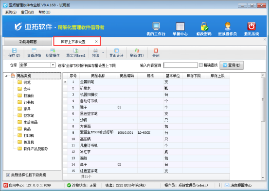 以“亞拓管理軟件專業(yè)版”為例,介紹如何設置庫存的上下限數(shù)量,在功能導航窗選擇“倉庫管理”—》“庫存上下限”進入庫存上下限設置界面,具體如圖1所示:
