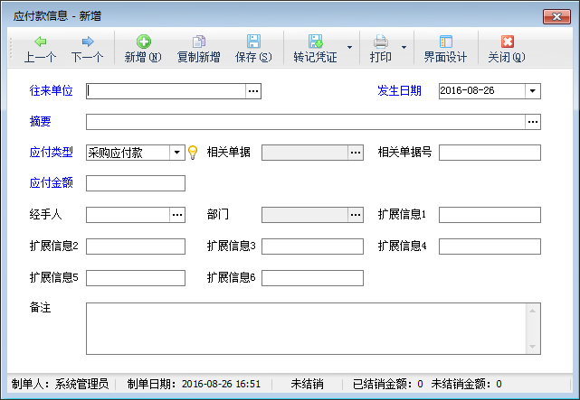 應(yīng)付類型:應(yīng)付類型包括采購應(yīng)付款、采購預(yù)付款、采購?fù)素洃?yīng)退款、期初應(yīng)付款、其他應(yīng)付款,應(yīng)付類型有特殊含義無法維護,如果需要標(biāo)注其他應(yīng)付類型可以填寫到擴展信息中。