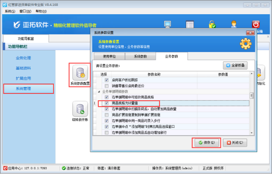 以紅管家送貨單為例,來(lái)說(shuō)一下如何設(shè)置商品規(guī)格為計(jì)量值,首先設(shè)置一下系統(tǒng)參數(shù),勾選上“商品規(guī)格為計(jì)量值”的參數(shù)設(shè)置,具體設(shè)計(jì)步驟如下圖所示: