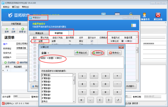 設(shè)置好參數(shù)后,功能導(dǎo)航欄點(diǎn)擊“業(yè)務(wù)處理”新開(kāi)送貨單,打開(kāi)界面設(shè)計(jì)選擇“單據(jù)明細(xì)”的金額,金額的取值方式選擇“計(jì)算公式”;取值設(shè)置設(shè)置為“{規(guī)格} *{數(shù)量} *{單價(jià)}”保存計(jì)算公式,最后保存界面設(shè)計(jì)。操作步驟如下圖: