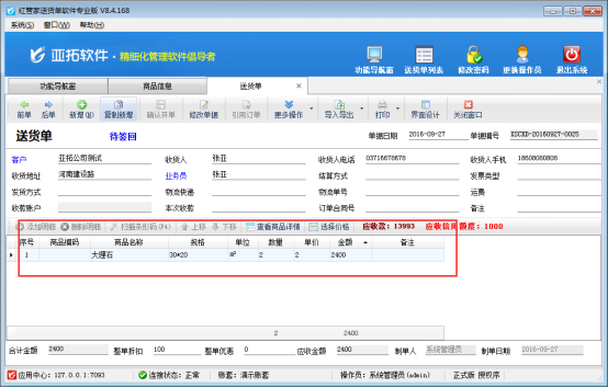 設(shè)置好以后進(jìn)行開(kāi)單,選擇商品為大理石(規(guī)格是30*20),假設(shè)數(shù)量為2,單價(jià)為2,金額=規(guī)格*數(shù)量*單價(jià)=30*20*2*2=2400。具體在單據(jù)中體現(xiàn)如下圖所示