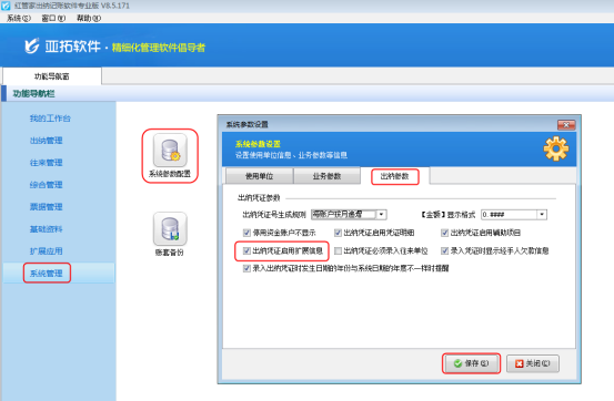 打開“系統管理”—》“系統參數配置”,在“出納參數”界面勾選“出納憑證啟用擴展信息”然后保存,如圖1所示。
