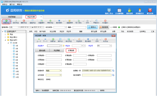 保存以后,在功能導航窗選擇“出納管理”進入日記賬界面,新增日記賬,在新增憑證窗口顯示“擴展信息”頁面可以錄入憑證的擴展信息,如下圖2所示。