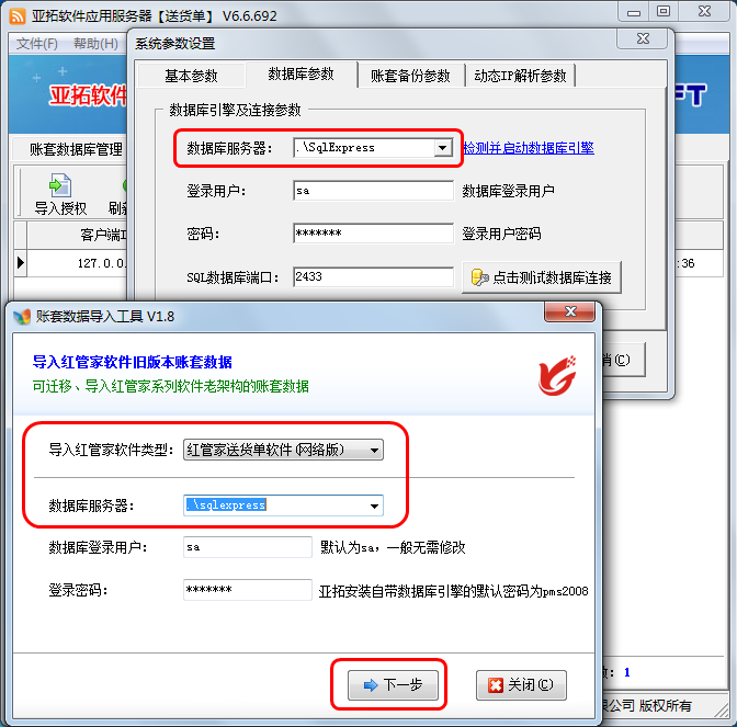 導(dǎo)入紅管家送貨單軟件(網(wǎng)絡(luò)版)賬套數(shù)據(jù):首先“導(dǎo)入紅管家軟件類型”選擇“紅管家送貨單軟件(網(wǎng)絡(luò)版)”,然后選擇數(shù)據(jù)庫(kù)服務(wù)器(與老架構(gòu)應(yīng)用服務(wù)器內(nèi)“系統(tǒng)參數(shù)設(shè)置”——》“數(shù)據(jù)庫(kù)參數(shù)”內(nèi)所設(shè)置的“數(shù)據(jù)庫(kù)服務(wù)器”保持一致,如下圖三所示),然后點(diǎn)擊“下一步”,選擇需要導(dǎo)入的賬套文件點(diǎn)擊“開(kāi)始導(dǎo)入”即可開(kāi)始導(dǎo)入網(wǎng)絡(luò)版賬套數(shù)據(jù)。