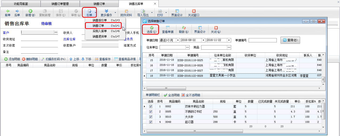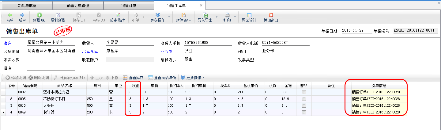 銷(xiāo)售訂單新增完成后,然后在功能導(dǎo)航窗點(diǎn)擊“銷(xiāo)售管理”——》“銷(xiāo)售出庫(kù)單”打開(kāi)銷(xiāo)售出庫(kù)單界面新增銷(xiāo)售出庫(kù)單,在工具欄點(diǎn)擊“引單”—》“銷(xiāo)售訂單”可打開(kāi)“選擇銷(xiāo)售訂單”窗口,在此窗口選擇需要發(fā)貨的銷(xiāo)售訂單,編輯發(fā)貨明細(xì)信息,然后保存審核出庫(kù)即可。