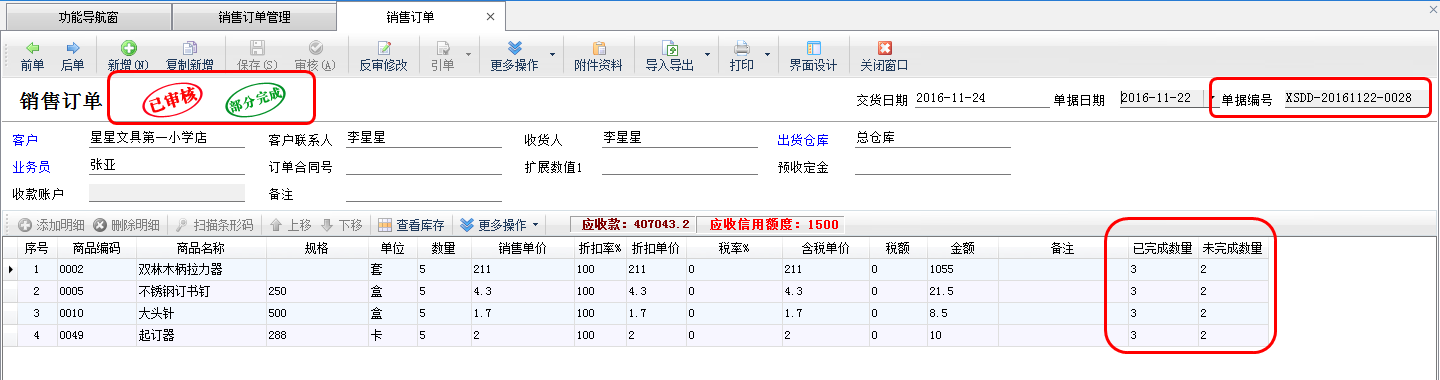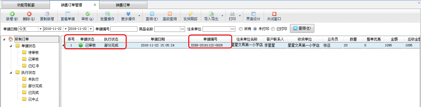 “銷(xiāo)售出庫(kù)單”引用“銷(xiāo)售訂單”出庫(kù)后,在銷(xiāo)售訂單管理界面查看銷(xiāo)售訂單執(zhí)行狀態(tài)會(huì)變?yōu)椤耙淹瓿伞被蛘摺安糠滞瓿伞睜顟B(tài)。點(diǎn)擊“查看單據(jù)”按鈕重新打開(kāi)“已完成/部分完成”的銷(xiāo)售訂單,可以查看銷(xiāo)售訂單的完成情況(已完成數(shù)量/未完成數(shù)量)。