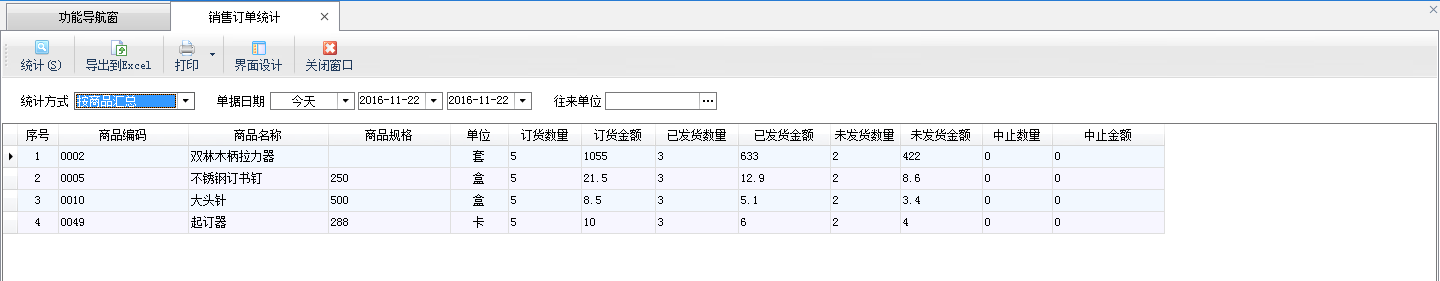銷(xiāo)售訂單統(tǒng)計(jì):可以從商品、業(yè)務(wù)員、往來(lái)單位三種角度匯總銷(xiāo)售訂貨情況、已發(fā)貨情況、未發(fā)貨情況和中止情況。點(diǎn)“統(tǒng)計(jì)方式”可以選擇具體的統(tǒng)計(jì)方式,默認(rèn)會(huì)按照商品進(jìn)行統(tǒng)計(jì)。