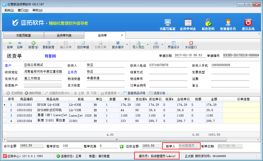 亞拓管理軟件、紅管家送貨單軟件、紅管家倉(cāng)庫(kù)管理軟件、紅管家出納記賬軟件、紅管家票據(jù)打印軟件等安裝后默認(rèn)登陸的操作員為“系統(tǒng)管理員”,開單時(shí)“制單人”數(shù)據(jù)為當(dāng)前操作員名稱(即“系統(tǒng)管理員”),部分用戶在使用軟件時(shí)需要將其修改為其他名稱,在軟件內(nèi)如何修改呢?本篇文章以紅管家送貨單軟件為例詳細(xì)介紹一下如何修改“制單人”名稱?