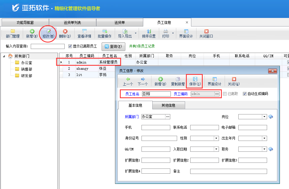 在功能導(dǎo)航窗點(diǎn)擊“基礎(chǔ)資料”——》“員工信息”,打開員工信息主界面,選擇“系統(tǒng)管理員”修改資料并保存,如圖二所示中將“系統(tǒng)管理員”修改為“亞拓”,修改之后重新登陸軟件開單時(shí),即可看到“制單人”已更改為“亞拓”,如圖三所示。