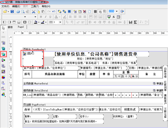 首先,在導航欄選擇“業務處理”—》“新增送貨單”—》打印—》打印格式設計—》設計格式,進入打印模板的設計器界面,點擊左側工具欄的“插入圖片”把圖片放在設計器界面的“頁標頭”位置中,如下圖1所示: