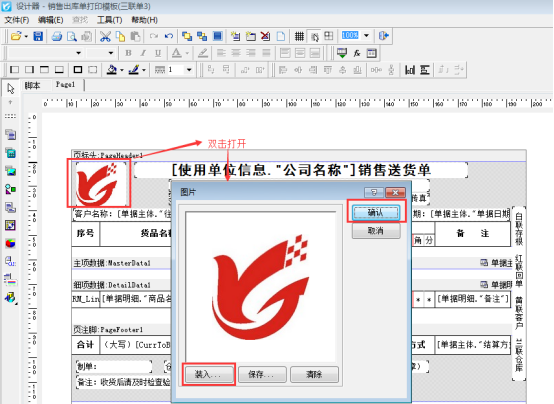 方式一:直接在模板設計器中添加,雙擊打開添加的圖片文本框,彈出圖片,點擊“裝入”可直接選擇電腦上的圖片,選擇后會在圖片中顯示,點擊確認按鈕,則圖片保存完成,如下圖2所示: