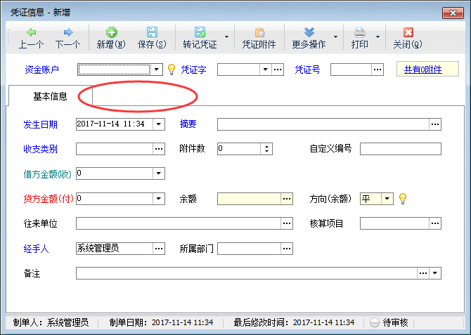 設置完成之后,我們在功能導航窗點擊“出納管理”—》“現金日記賬”打開日記賬界面,新增日記賬,在新增日記賬界面可以看到“憑證明細”功能已啟用,如下圖所示。