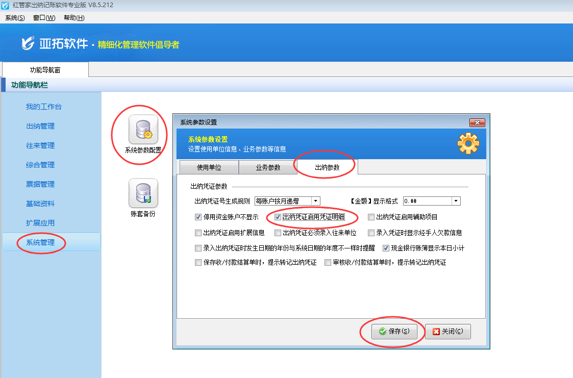 在功能導航窗點擊“系統管理”—》“系統參數配置”—》“出納參數”,即可進入到“出納參數”配置界面,在出納參數內打鉤啟用“出納憑證啟用憑證明細”參數,然后保存配置,如下圖所示。