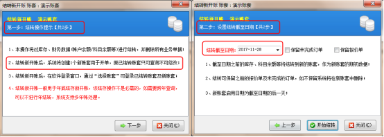 點擊“結(jié)轉(zhuǎn)新開賬”會彈出結(jié)轉(zhuǎn)新開賬界面,分成兩步操作,第一步:結(jié)轉(zhuǎn)操作提示;第二步:設置結(jié)轉(zhuǎn)截止日期。如下圖2所示: