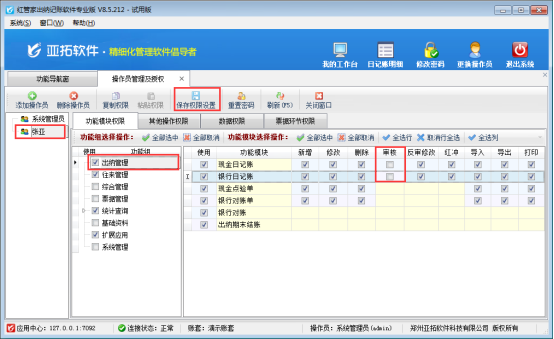 以紅管家出納記賬軟件專業(yè)版本為例,示范下如何取消操作員“張亞”的現(xiàn)金日記賬、銀行日記賬的可審核權(quán)限。在功能導(dǎo)航窗選擇“系統(tǒng)管理”—》“操作員及授權(quán)”—》選擇操作員“張亞”,在功能模塊權(quán)限中選擇“出納管理”,右側(cè)權(quán)限設(shè)置把現(xiàn)金日記賬和銀行日記賬的可審核權(quán)限的勾選符號(hào)取消,然候點(diǎn)擊“保存權(quán)限設(shè)置”按鈕進(jìn)行保存權(quán)限,如下圖1所示: