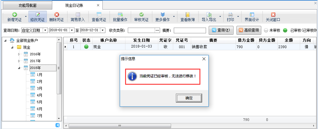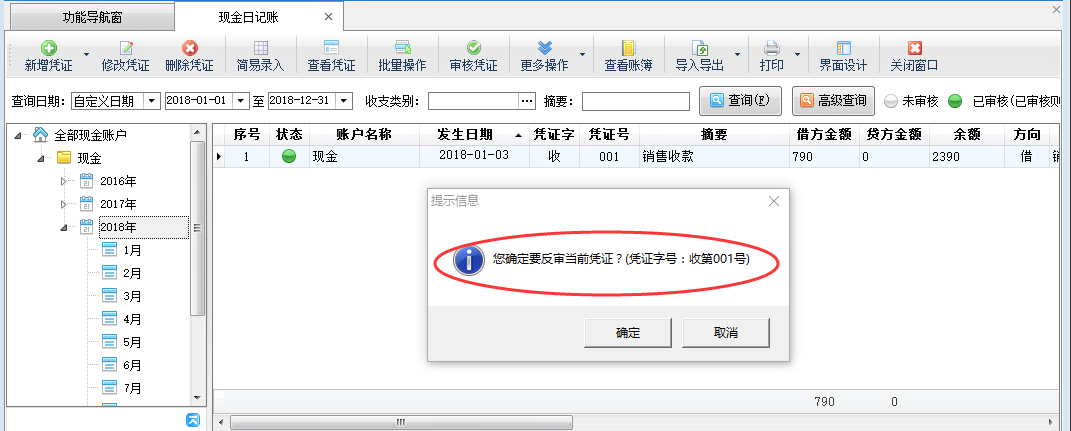 在功能導(dǎo)航窗點(diǎn)擊“現(xiàn)金日記賬”打開現(xiàn)金日記賬界面,選擇一個“已審核”的日記賬憑證,然后點(diǎn)擊“更多操作”—》“反審憑證”(如下圖二所示),系統(tǒng)會彈出提示信息“您確定要反審當(dāng)前憑證?”(如下圖三所示),點(diǎn)擊“確定”按鈕即可對“已審核”憑證進(jìn)行反審操作,反審后,憑證狀態(tài)變?yōu)椤拔磳徍恕保藭r可以對這個未審核的憑證進(jìn)行修改操作(如下圖四所示)。