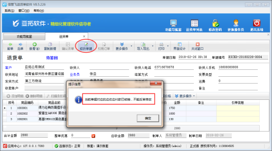 亞拓軟件自主開發(fā)的信管飛送貨單軟件、亞拓管理軟件等都支持將送貨單(銷售單)進(jìn)行收款結(jié)銷操作,有時(shí)可能存在送貨單商品明細(xì)開錯(cuò)的情況。如果當(dāng)前送貨單的應(yīng)收款已結(jié)銷,軟件是不允許再修改此單據(jù)的,如下圖1所示: