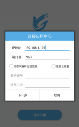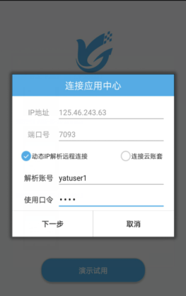 此連接需要購(gòu)買動(dòng)態(tài)IP解析服務(wù),在電腦端應(yīng)用中心啟用動(dòng)態(tài)IP解析服務(wù)后,手機(jī)APP登錄界面點(diǎn)擊選擇賬套,勾選上啟用動(dòng)態(tài)IP解析,輸入解析賬號(hào)和使用口令,點(diǎn)擊“下一步”選擇賬套登錄,如下圖4、5所示:
