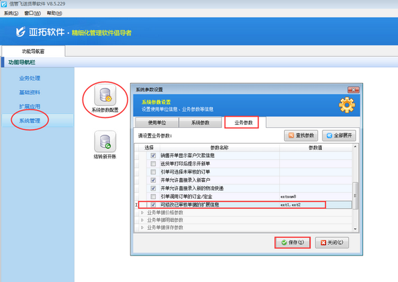 在功能導(dǎo)航窗點(diǎn)擊“系統(tǒng)管理”→“系統(tǒng)參數(shù)設(shè)置”→“業(yè)務(wù)參數(shù)”可以進(jìn)入到“業(yè)務(wù)參數(shù)”配置界面,在業(yè)務(wù)單據(jù)相關(guān)參數(shù)內(nèi)打勾啟用“可修改已審核單據(jù)的擴(kuò)展信息”參數(shù),并設(shè)置參數(shù)值(擴(kuò)展信息字段名),默認(rèn)為“ext1,ext2(擴(kuò)展信息1,擴(kuò)展信息2)”,如下圖一所示。