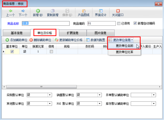 在“商品信息修改”窗口,點擊“單位及價格”,進入單位及價格界面,點擊“更改單位信息”——》“更改單位名稱”。具體步驟如下圖展示:
