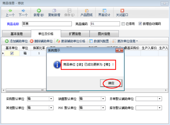 在圖3中,點擊“是”按鈕可以進行修改單位名稱,示例中是把單位“袋”修改為“箱”,修改后顯示為:
