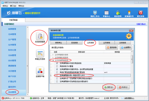 在功能導(dǎo)航窗點擊“系統(tǒng)管理”—》“系統(tǒng)參數(shù)配置”—》“業(yè)務(wù)參數(shù)”,即可進入到“業(yè)務(wù)參數(shù)”配置界面,在業(yè)務(wù)單據(jù)明細(xì)參數(shù)內(nèi)找到“在單據(jù)明細(xì)中同一商品可錄入多行”參數(shù),把這個參數(shù)的勾選去掉,然后保存,如下圖二所示。