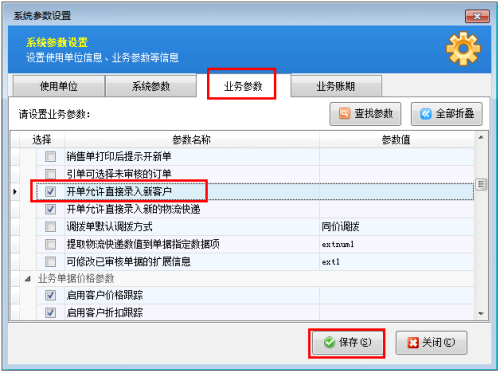 軟件中默認是允許開單時直接錄入新客戶/供應商的。如果該業(yè)務參數(shù)沒有被勾選,需要我們在使用此功能之前對相應的業(yè)務參數(shù)進行設(shè)置。在“業(yè)務參數(shù)”界面上我們將“開單允許直接錄入新客戶”勾選上,然后進行保存。