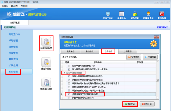 登錄軟件,在功能導(dǎo)航窗點擊“系統(tǒng)管理”—》“系統(tǒng)參數(shù)配置”—》“業(yè)務(wù)參數(shù)”可以進入“業(yè)務(wù)參數(shù)”配置界面,在業(yè)務(wù)單據(jù)保存參數(shù)內(nèi)打勾啟用“訂單保存時交貨日期不能為空”參數(shù),如下圖1所示。