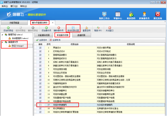 以信管飛倉庫管理軟件為例,示范下如何設(shè)置操作員不能修改單據(jù)編號的權(quán)限。在功能導(dǎo)航窗選擇“系統(tǒng)管理”—》“操作員及授權(quán)”進(jìn)入操作員管理及授權(quán)界面。選擇普通操作員組的操作員“張亞”,點(diǎn)擊右側(cè)功能權(quán)限設(shè)置模塊,點(diǎn)擊“其他操作權(quán)限”,在下邊的權(quán)限中找到“可修改單據(jù)編號”,把勾選“√”符號取消(鼠標(biāo)單擊即可取消)。點(diǎn)擊保存權(quán)限設(shè)置。如下圖1所示:
