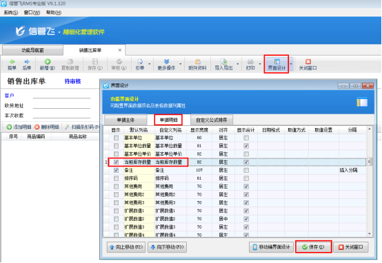 打開軟件的“銷售管理”模塊,新開一個(gè)銷售出庫單,點(diǎn)擊“界面設(shè)計(jì)”選擇“單據(jù)明細(xì)”數(shù)據(jù)項(xiàng),找到“當(dāng)前庫存數(shù)量”數(shù)據(jù)項(xiàng)并勾選上,保存界面設(shè)計(jì)。如圖1所示:
