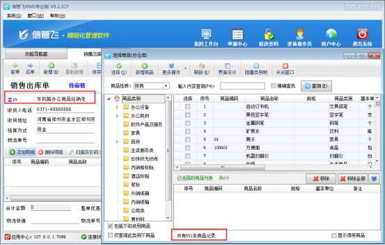 信管飛RMS軟件、信管飛倉庫管理軟件和信管飛送貨單軟件開單時都支持選擇系統內已錄入的商品信息,進行快速選擇商品來開單。選擇商品時在選擇商品窗口默認是可以顯示所有商品(圖1),但是部分用戶在選擇商品時只需要顯示此客戶相關的商品,如何設置呢?本篇文章我們以信管飛RMS 專業版軟件為例來詳細介紹一下如何設置在選擇商品窗口僅顯示客戶相關商品?