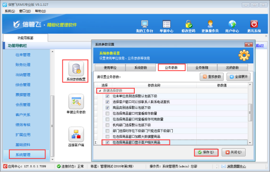 在功能導航窗點擊“系統管理”—》“系統參數配置”—》“業務參數”,即可進入到“業務參數”配置界面,在數據選擇參數內打鉤啟用“在選擇商品窗口顯示客戶相關商品”參數,然后點擊“保存”按鈕保存設置,如下圖2所示: