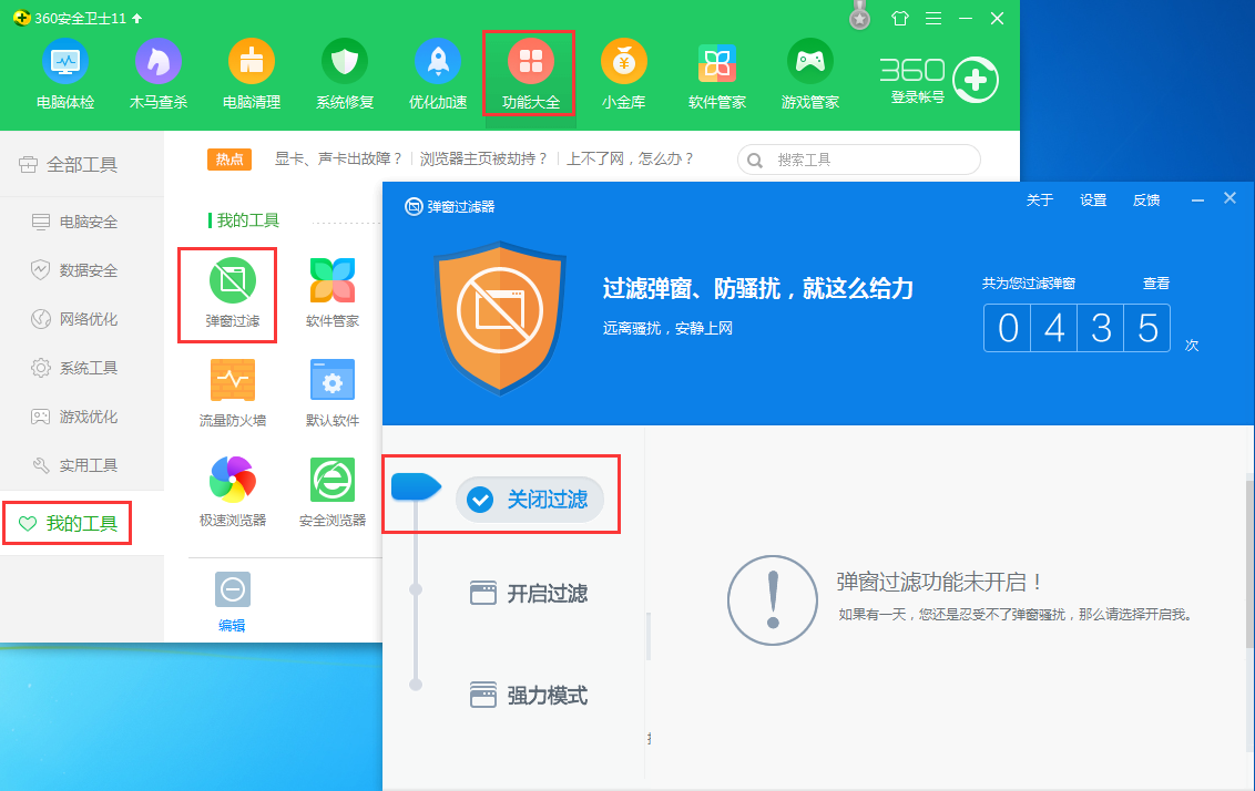 打開360安全衛士,在“功能大全”—》“我的工具”內找到“彈窗過濾”工具打開彈窗過濾器,點擊“關閉過濾”即可。