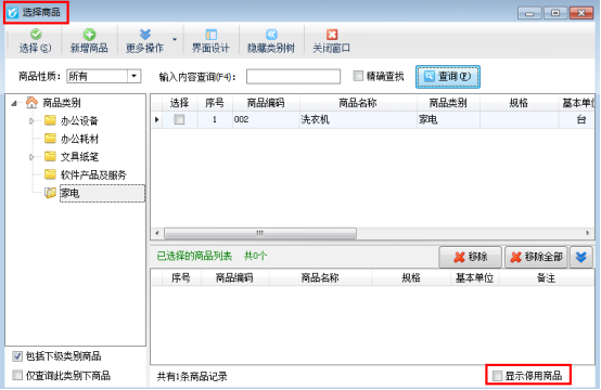 設置完成之后,新開一個單據,添加商品明細進行選擇商品時,“選擇商品”窗口默認不顯示已停用的商品,如圖2所示。