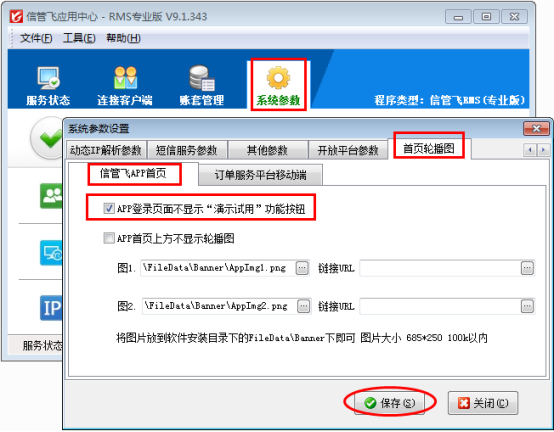 打開應(yīng)用中心窗口,點(diǎn)“系統(tǒng)參數(shù)”—》“首頁輪播圖”—》“信管飛APP首頁”,勾選“APP登錄頁面不顯示“演示試用”功能按鈕”,然后保存設(shè)置。如下圖所示:
